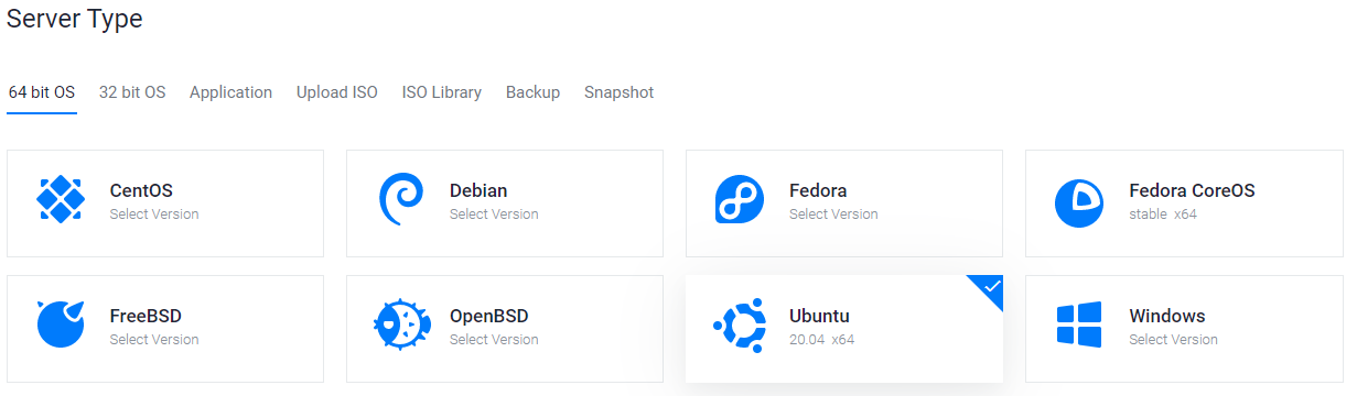 Select Ubuntu 24.04 x64 as the server type. We use this LTS release of Ubuntu instead of the latest version because LTS releases are supported with security updates for 5 years, instead of the usual 9 months.