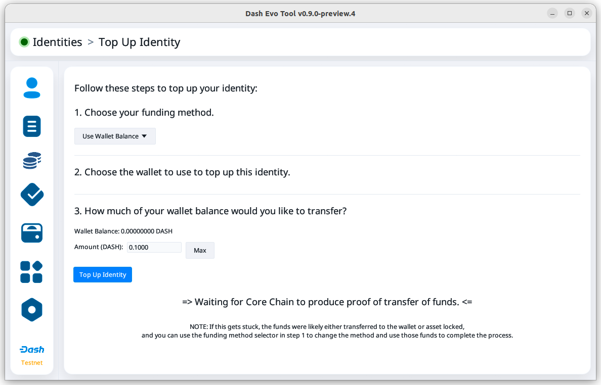 Before topping up an identity, make sure you have added a Dash Evo Tool wallet.
