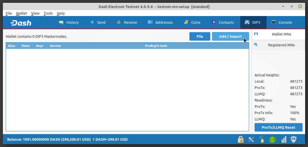 To setup a masternode, navigate to the DIP3 tab and click the Add/Import button.
