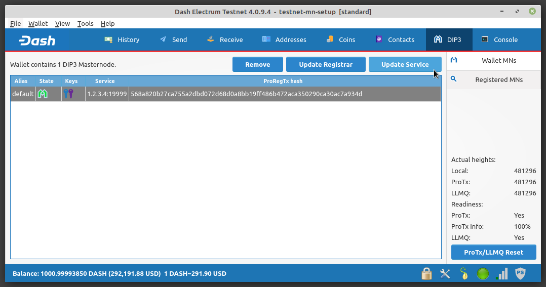 To update masternode service information, navigate to the DIP3 tab and click the Update Service button.