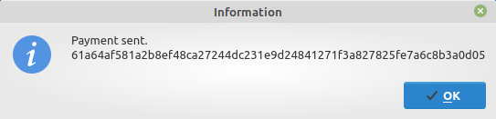 The transaction hash will be displayed once the transaction has been sent successfully. Click OK to close the screen.