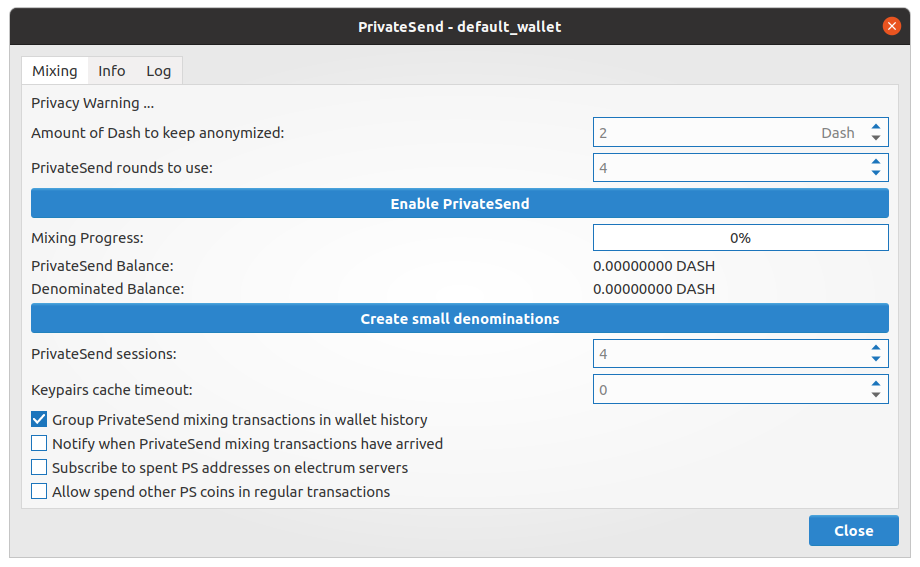 Enter the Amount of Dash to keep anonymized and the number of PrivateSend rounds to use. Then click Enable PrivateSend, followed by Start Mixing. The process will begin, and the Mixing Progress bar shows the completion progress. Additional information on the process is available on the Info and Log tabs.
