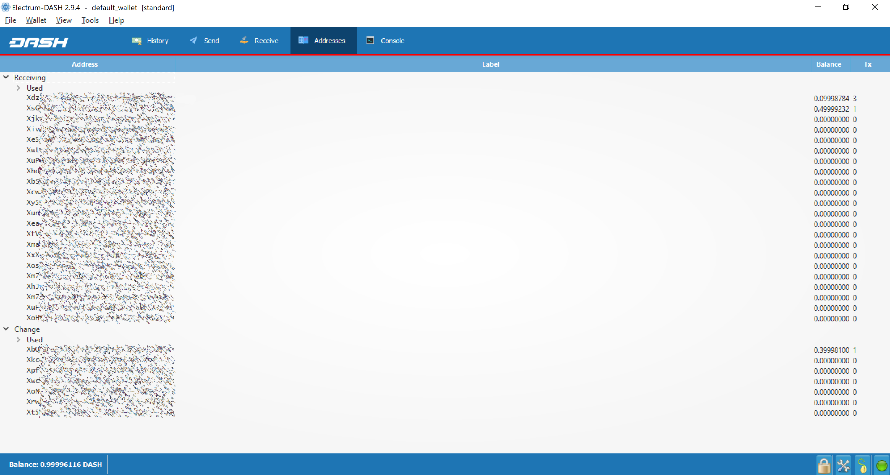 Notice that the total balance does not only show the sum of all receiving addresses, but also the separately listed Change addresses. Where did these new change addresses come from and why does the first one now hold funds?