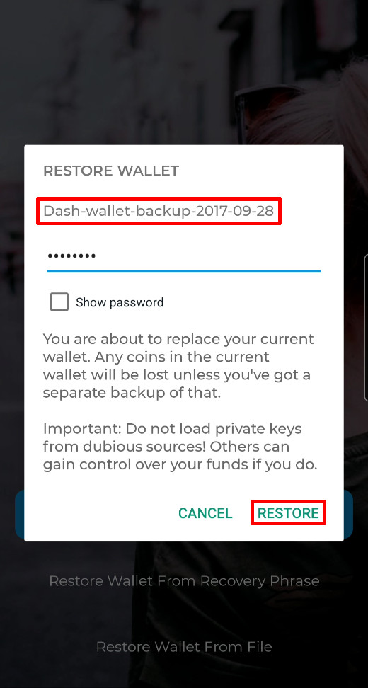 If file name is similar to dash-wallet-backup or includes the word ‘mobile’, try to restore using Dash Wallet for Android