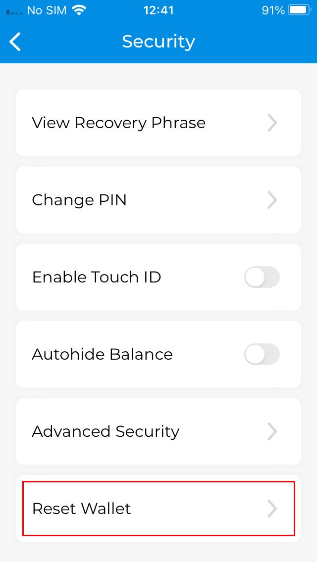 For devices that already have an active wallet, first write down the existing recovery phrase as a backup. Click the menu button on the bottom right corner and select Security > View Recovery Phrase to find it. After backing up the recovery phrase, reset the wallet by selecting the Security > Reset Wallet option and then proceed with restoring the backup file.