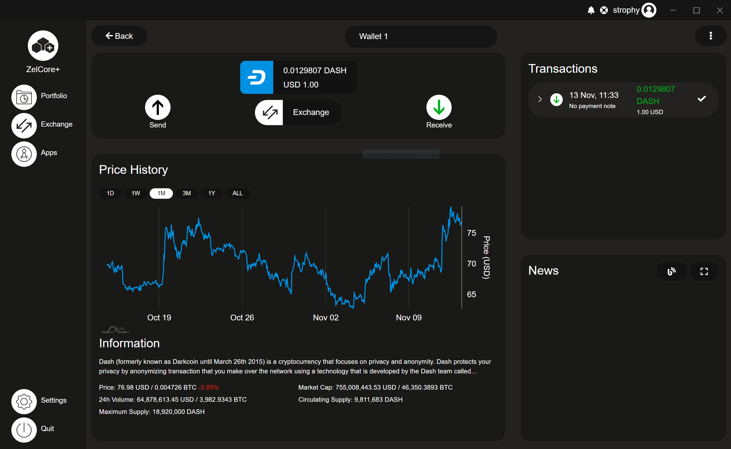 ADAMANT is a web wallet and messaging application with a strong focus on privacy. The app allows users to transfer Dash within a chat application. No registration or KYC is required, and the app is entirely open source.